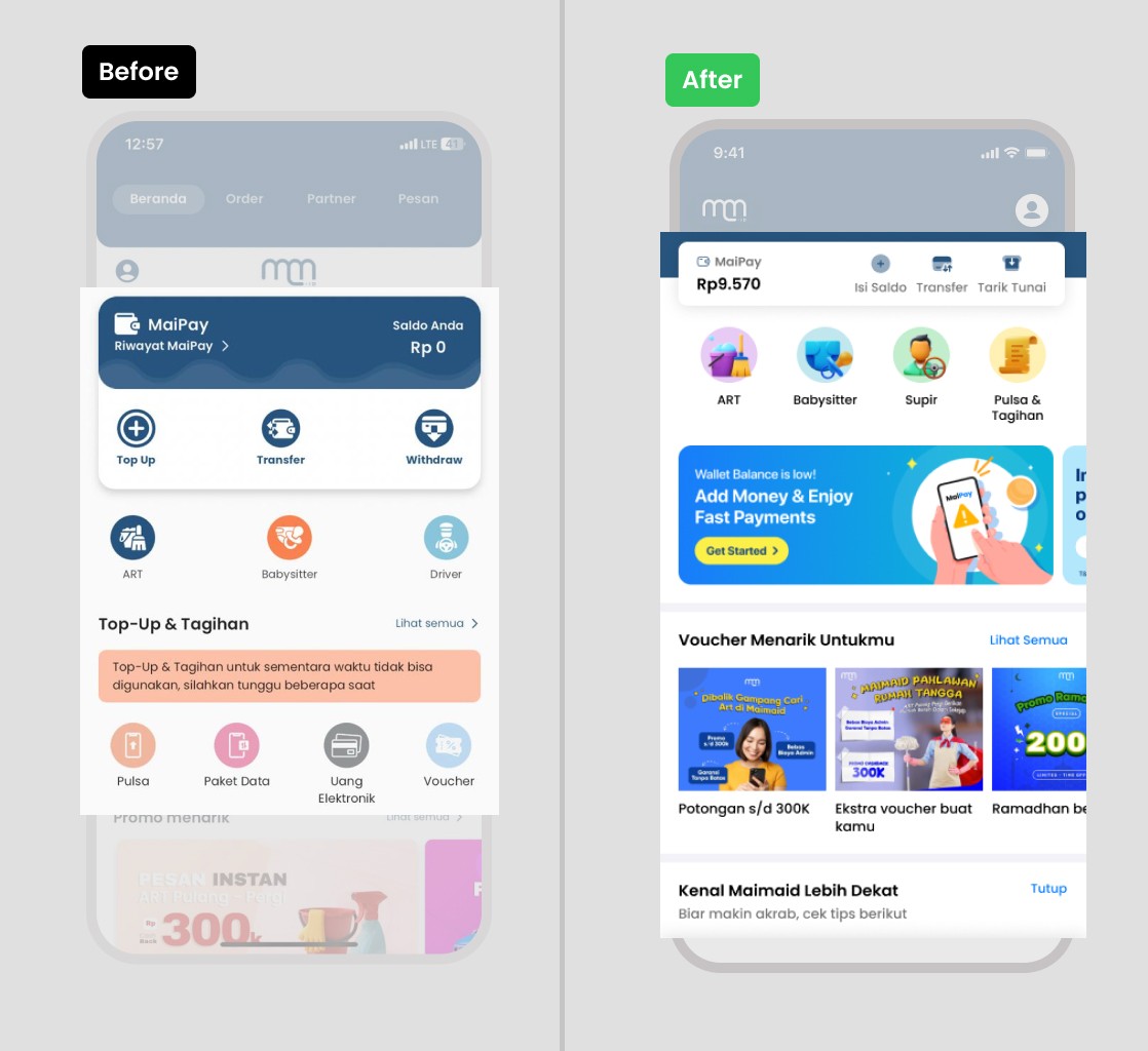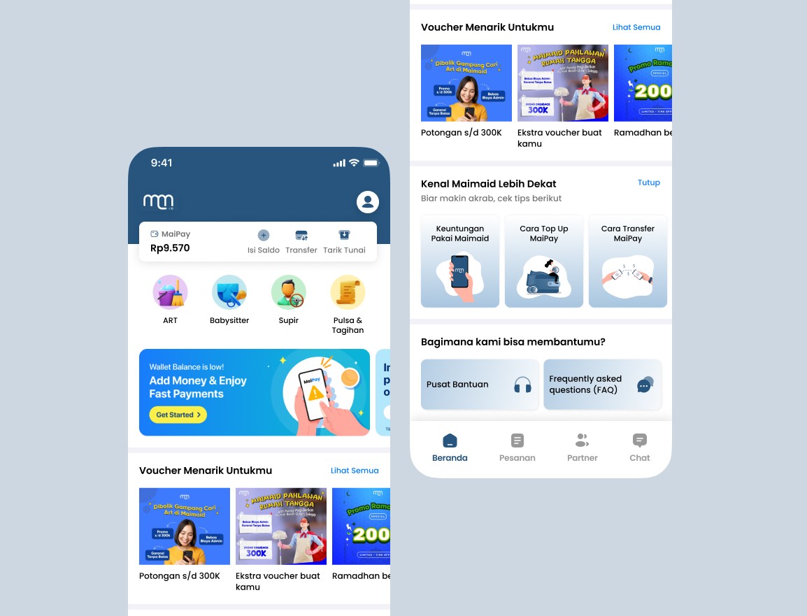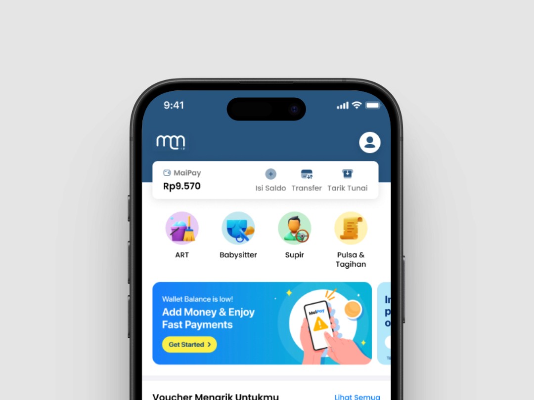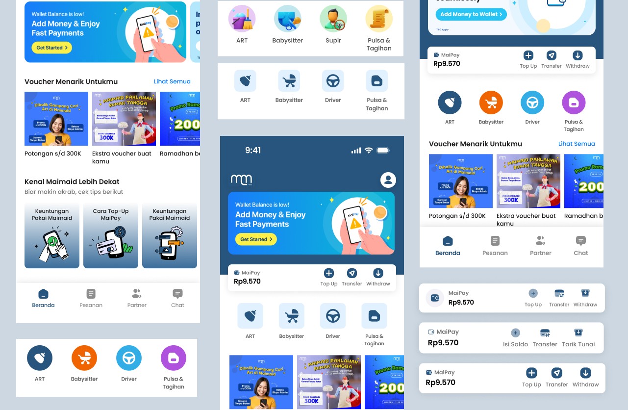 Maimaid.id is a mobile application offering a wide range of on-demand cleaning and household assistance services. The app also features a financial service called MaiPay, enabling users to Top Up, Transfer, and Withdraw their balance seamlessly. The homepage of the app is the first touchpoint for users, making it a crucial element in shaping their overall experience. This redesign project focuses on optimizing the homepage to create a more engaging, user-friendly interface that effectively communicates the app's core services and features.