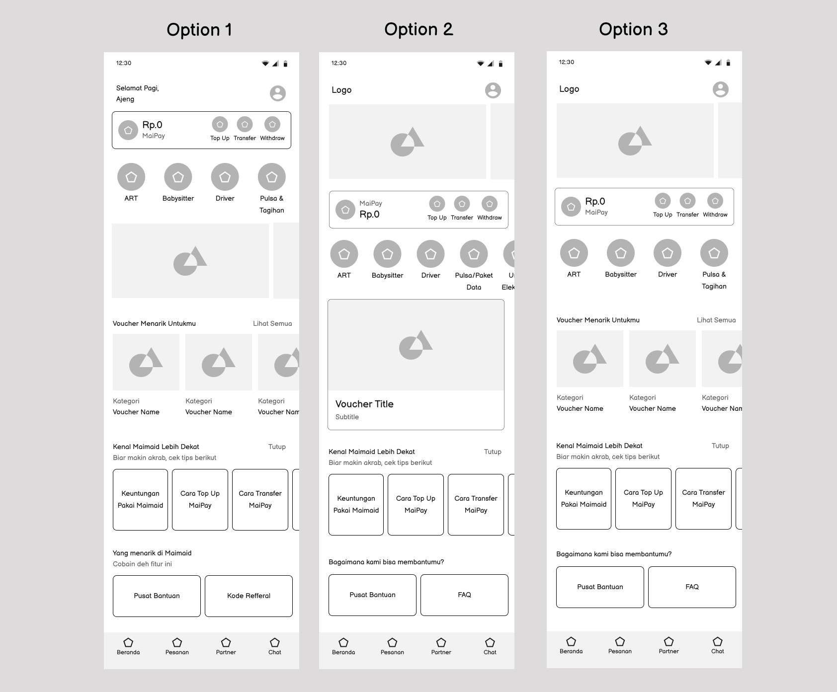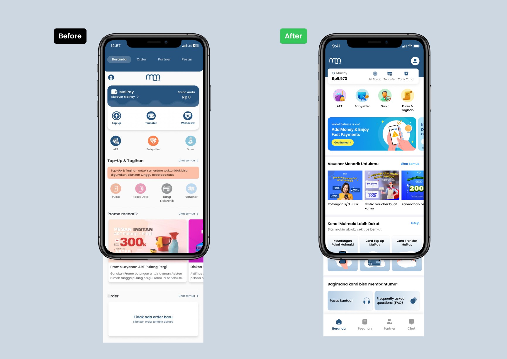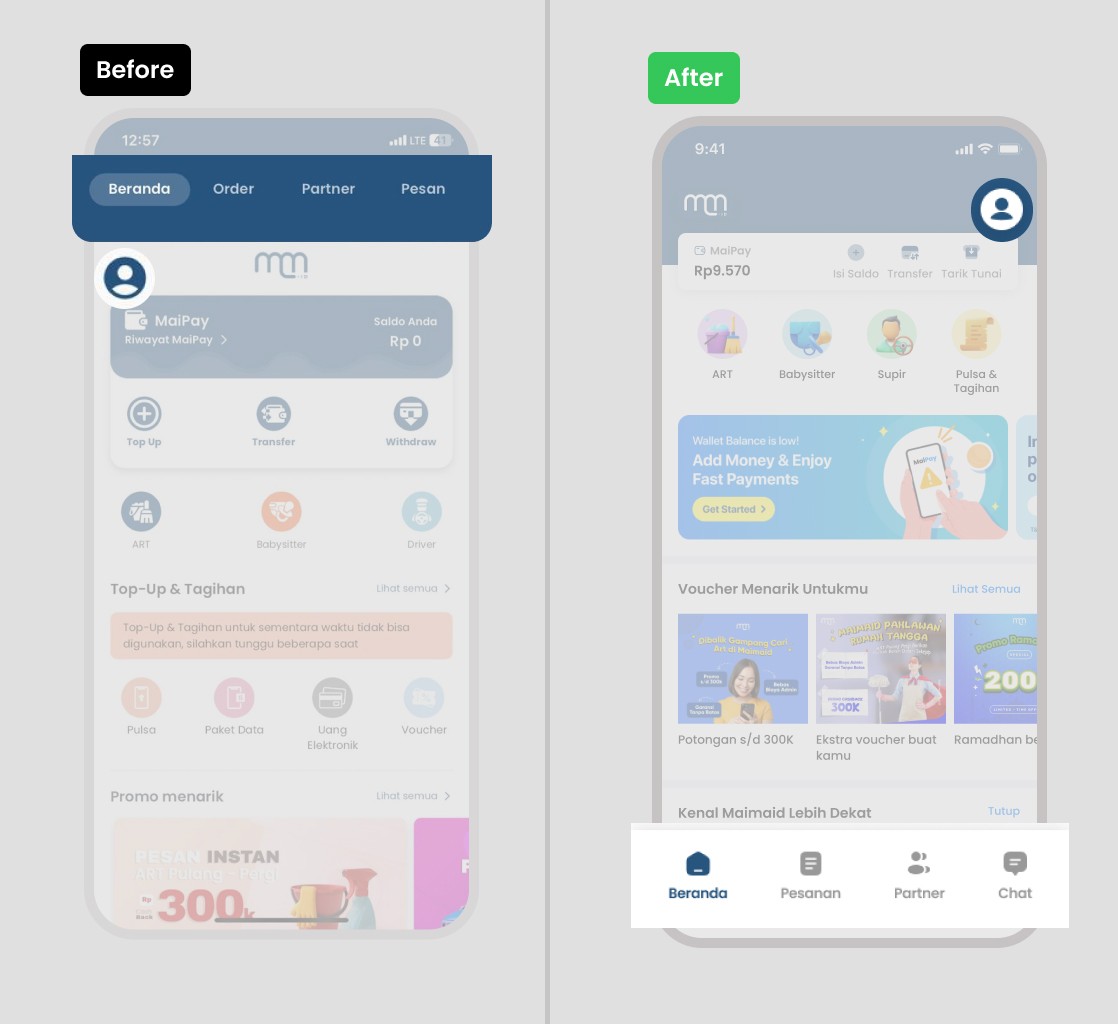 Maimaid.id is a mobile application offering a wide range of on-demand cleaning and household assistance services. The app also features a financial service called MaiPay, enabling users to Top Up, Transfer, and Withdraw their balance seamlessly. The homepage of the app is the first touchpoint for users, making it a crucial element in shaping their overall experience. This redesign project focuses on optimizing the homepage to create a more engaging, user-friendly interface that effectively communicates the app's core services and features.