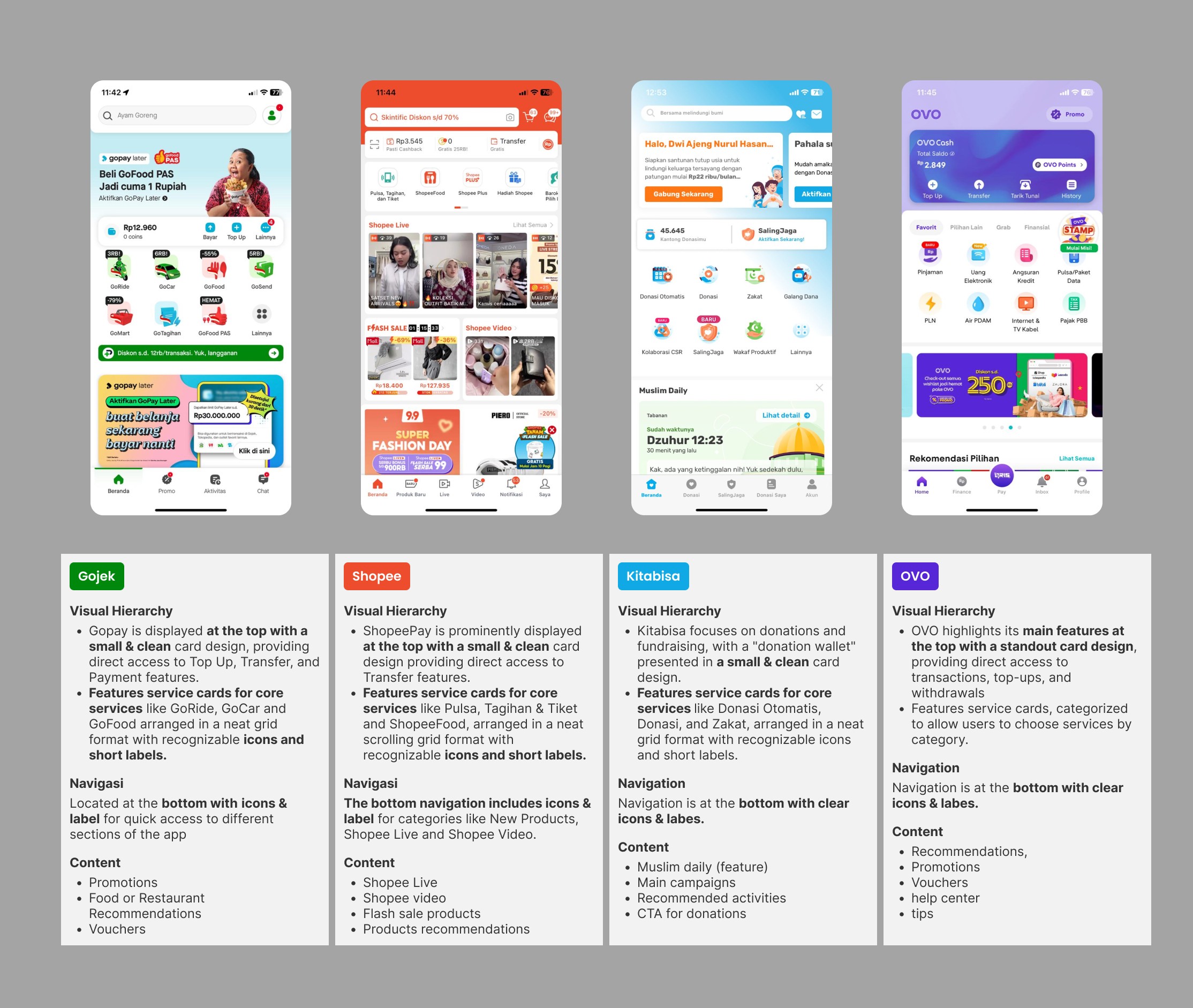 In this analysis, I noticed that apps like Gojek, Shopee, and Kitabisa use small, clean card designs to display financial features at the top, making it easy to access payments or donations. In contrast, OVO has a large, noticeable card for its financial options. All apps feature well-organized cards for core services at the top. Navigation is at the bottom with clear icons and labels, and the homepage includes promotions, recommendations, vouchers, tips, and a help center.